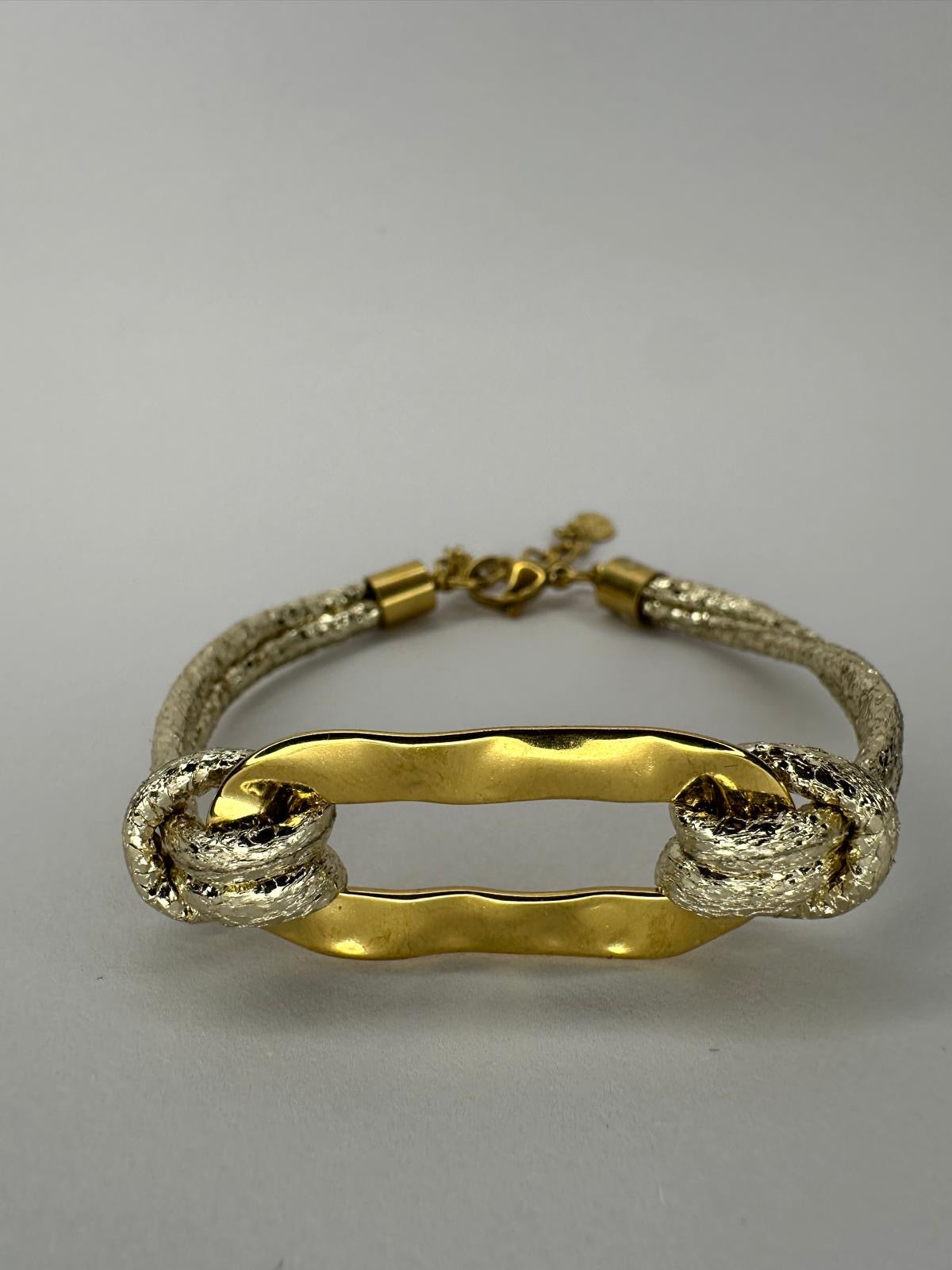 • Eslabón Central Grande (XL): Pieza central alargada y calada con un atractivo acabado martillado o irregular que capta la luz maravillosamente. Tono dorado intenso.