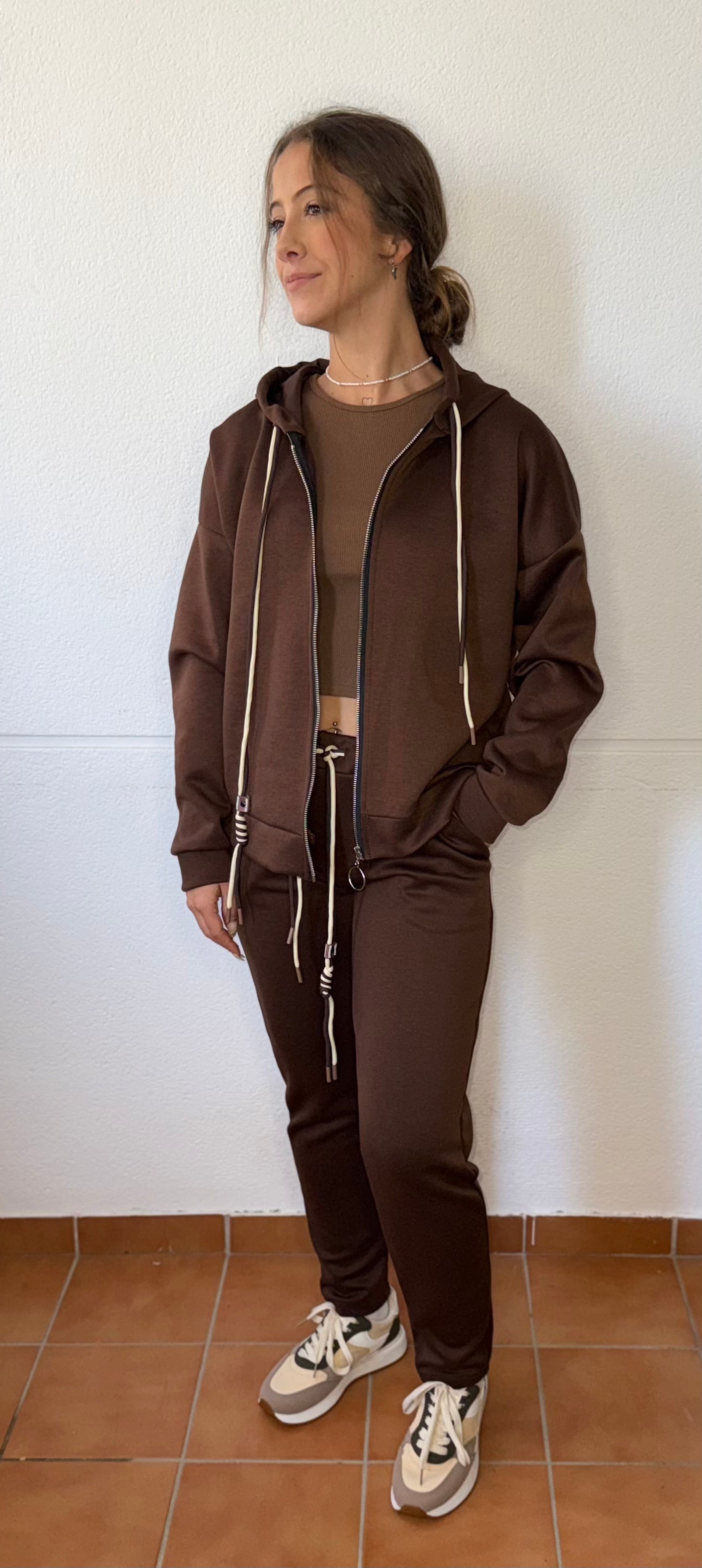Conjunto de dos piezas ideal para un look cómodo y con estilo. Incluye sudadera con cremallera, capucha ajustable con cordones decorativos y bolsillos laterales, junto con pantalón jogger de cintura elástica y cordón ajustable a juego.