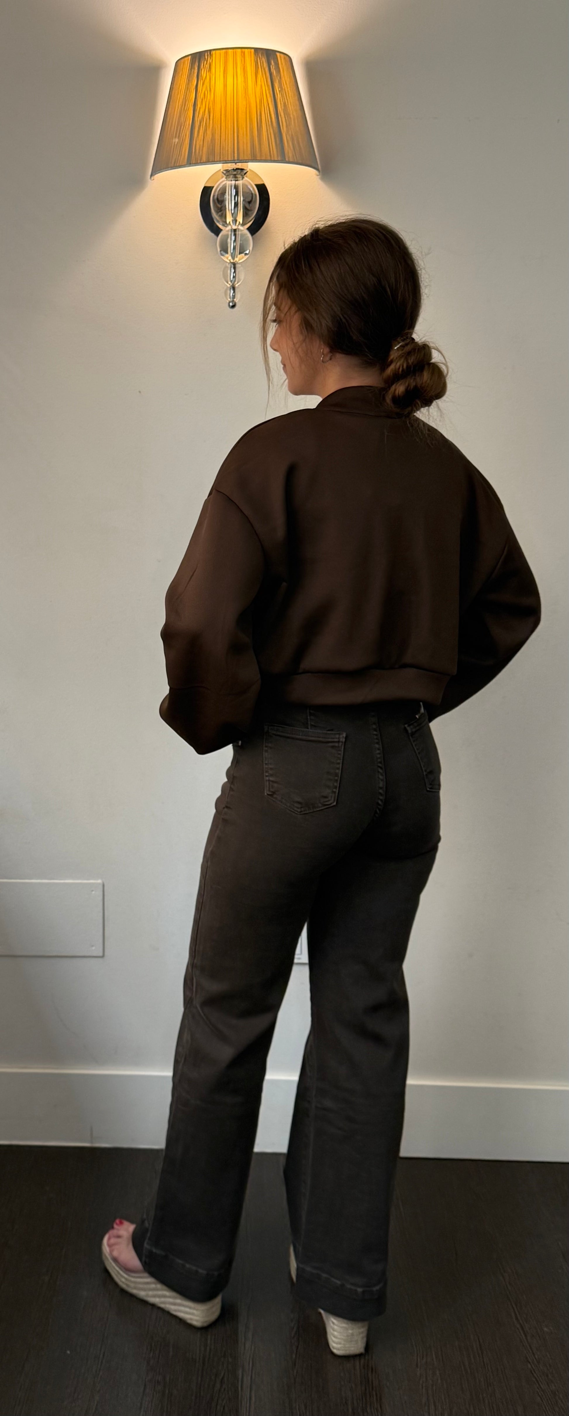 Chaqueta estilo varsity en tono marrón chocolate, perfecta para darle un toque actual a cualquier outfit. Presenta cierre de botones plateados, bolsillo delantero y un fit corto que realza la figura. Su tejido suave y el detalle de mangas ligeramente abombadas le dan un aire casual pero elegante.