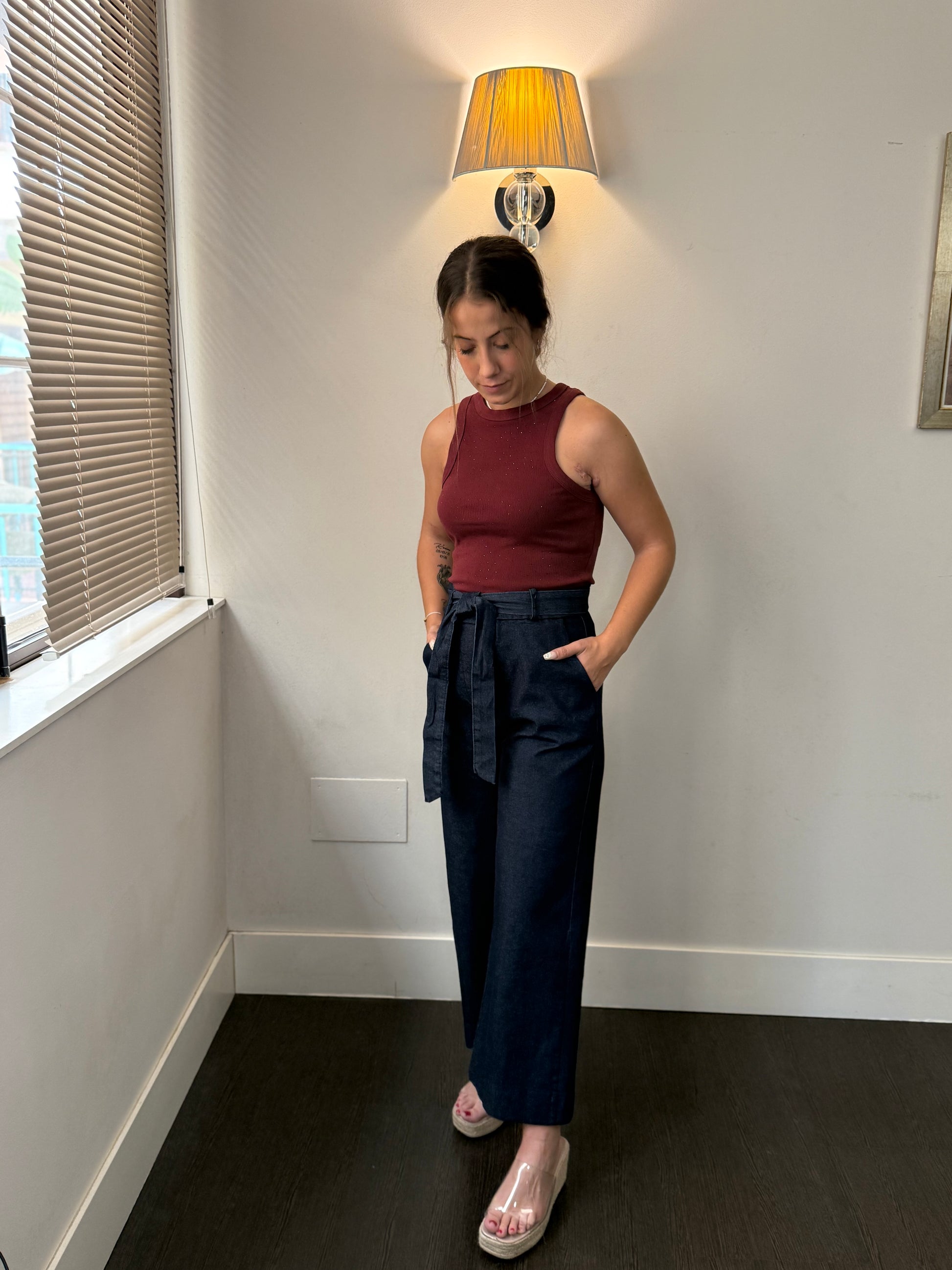 Pantalón estilo paperbag en tejido denim ligero, de corte recto y tiro alto. Cuenta con cinturón del mismo tejido para ajustar la cintura y resaltar la silueta, además de prácticos bolsillos laterales. Su diseño cómodo y versátil lo convierte en la prenda ideal tanto para looks casuales como para combinaciones más arregladas.