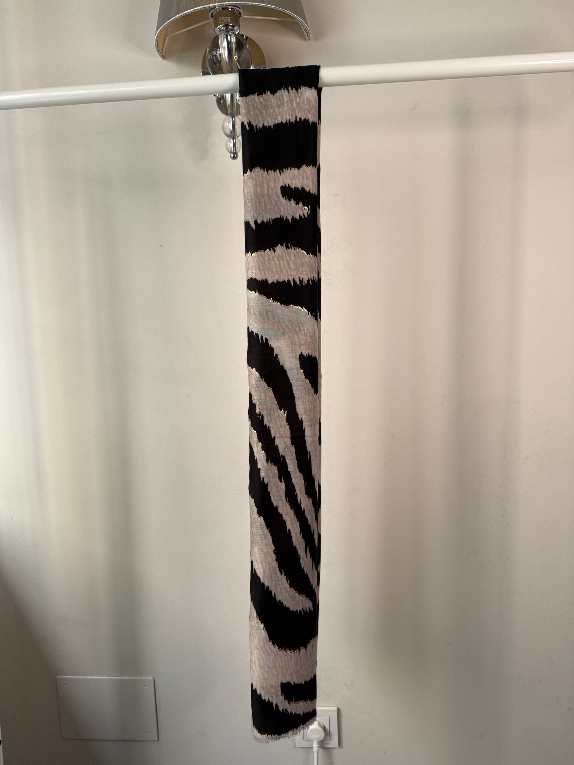 Captura miradas con este pañuelo de estampado cebra enérgico. Es un accesorio de alto impacto que equilibra a la perfección lo salvaje con lo sofisticado. Su diseño se destaca por el contraste de colores y un sutil detalle de brillo (glitter) en las rayas claras.