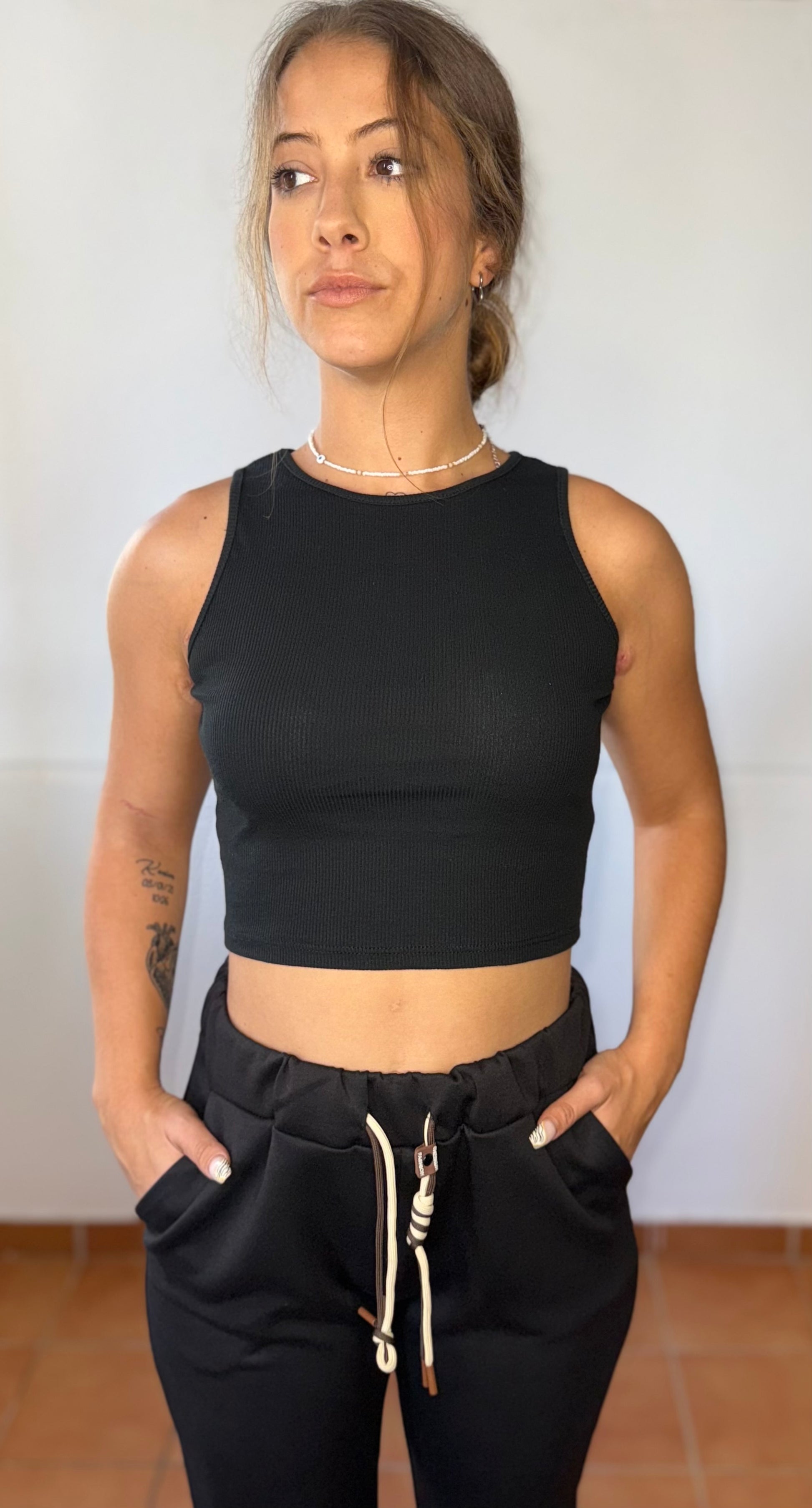 Un básico imprescindible en tu armario. Este top corto de tirantes anchos está confeccionado en tejido canalé elástico, lo que garantiza comodidad y un ajuste perfecto. Su diseño de cuello redondo y corte recto lo convierte en una prenda versátil, ideal para combinar tanto con looks casuales como con outfits más arreglados.