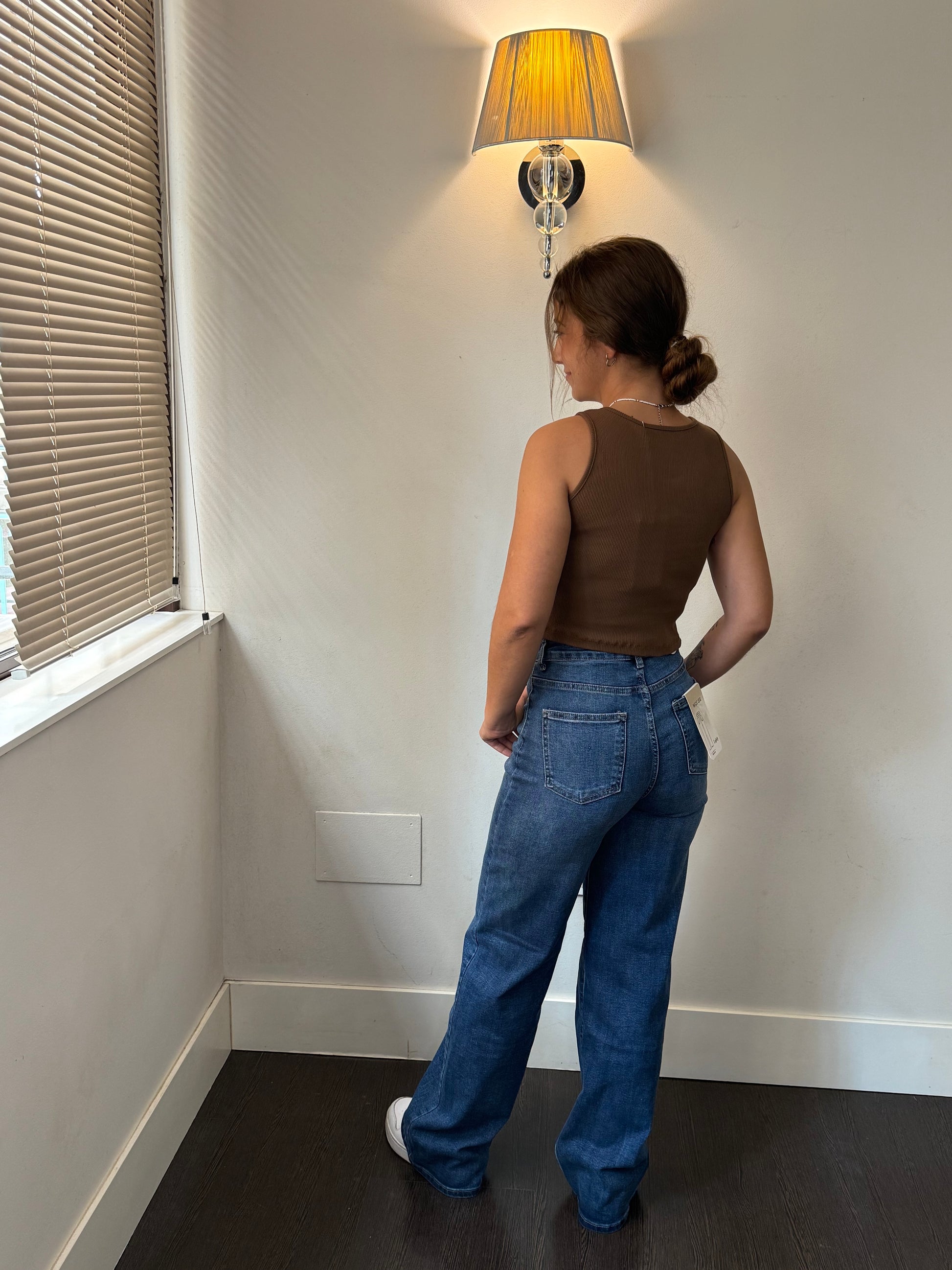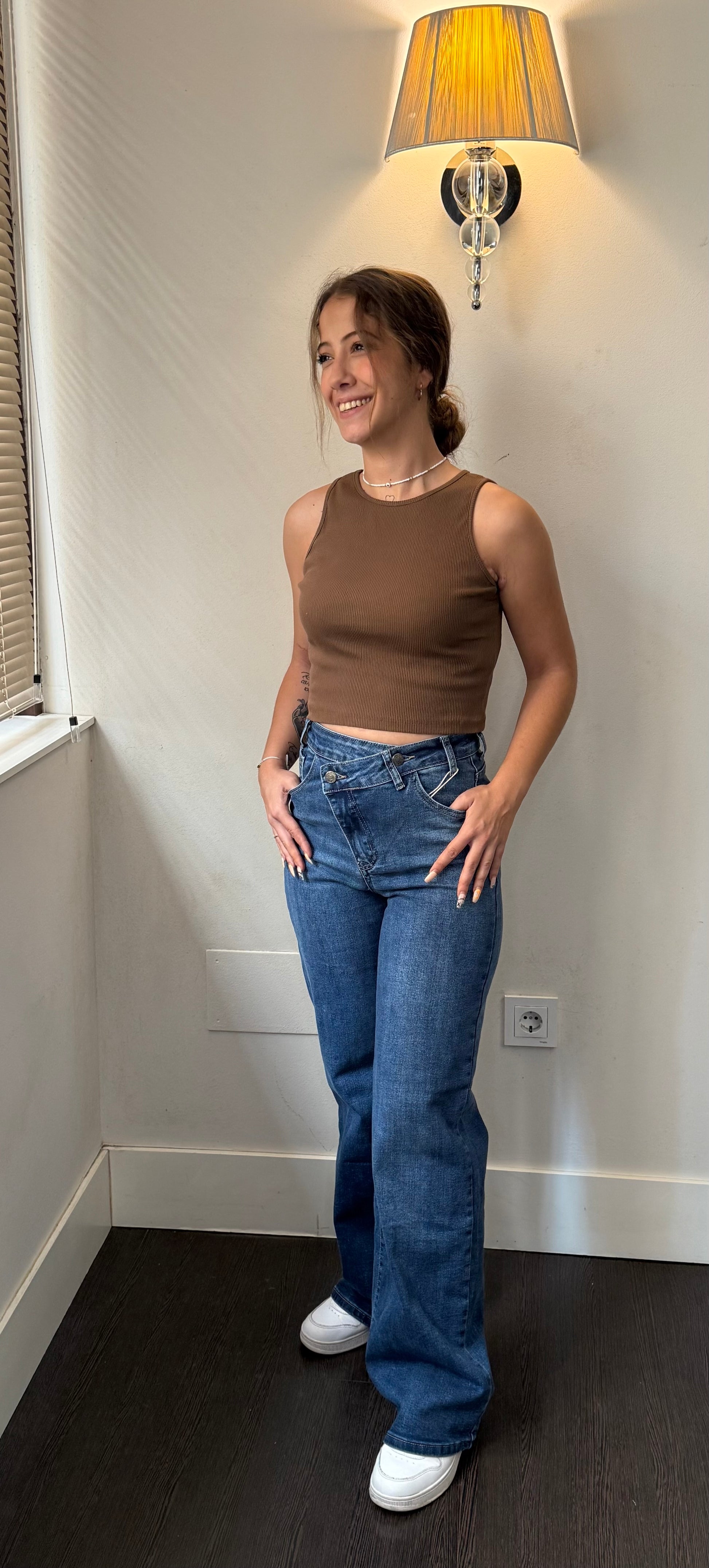 • Corte: De tiro alto, con pernera recta ligeramente ancha en la parte inferior (estilo recto o ligeramente acampanado).